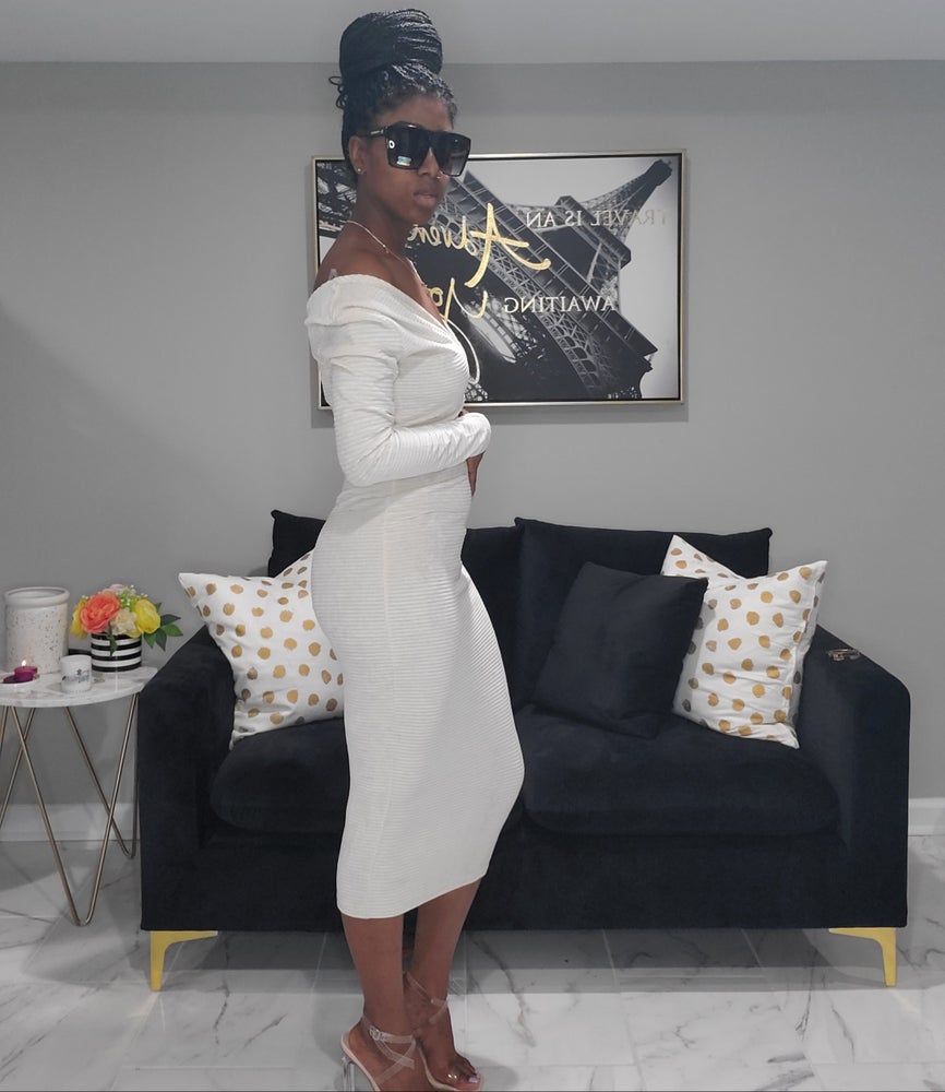 Ivory Midi Dress can be worn on or off shoulder 96% Polyester 4% Spandex Hand wash cold Line Dry