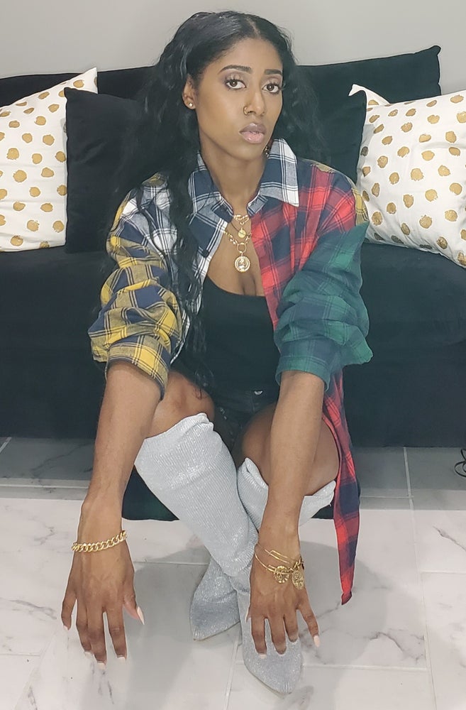 Multi print plaid top Model wearing Medium