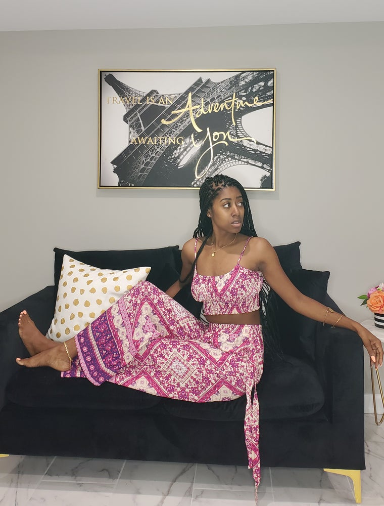 100% cotton 2 Piece Boho set. Crop top with adjustable spaghetti straps and has great stretch with flowy pants and belt detail.